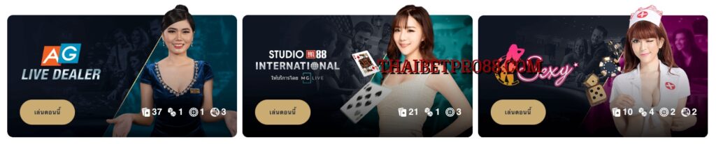 AG Live Dealer | บาคาร่าเสือมังกร ชนะด้วยไพ่สามใบบูลบูลไพ่สามใบSicbo | มีระบบวีไอพีที่มอบสิทธิพิเศษสำหรับสมาชิกวีไอพี รวมถึงมีบาคาร่าแจ็คพ็อต ที่แจกเงินรางวัลสูงถึง 64 ล้านบาท |